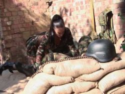 Die Fotze bläst den beiden Soldaten den Penis