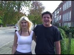 Hellblonde Bitch lutscht zwei große Lümmel bis sie abwichsen